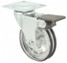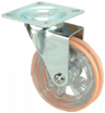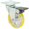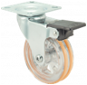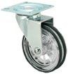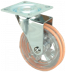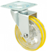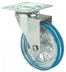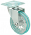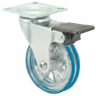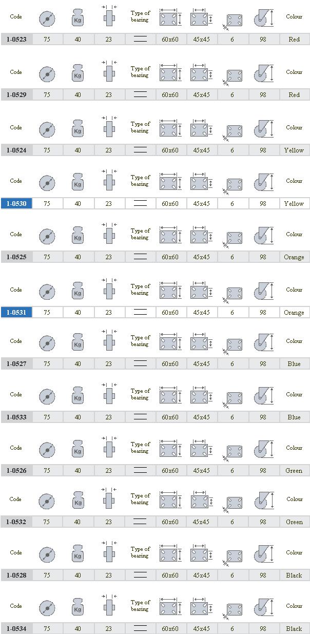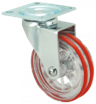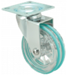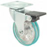 Kółka plastikowe półprzezroczyste, gumowane o średnicy 75mm mocowane na płytkę z bieżnią w różnych kolorach. Widelec chromowany